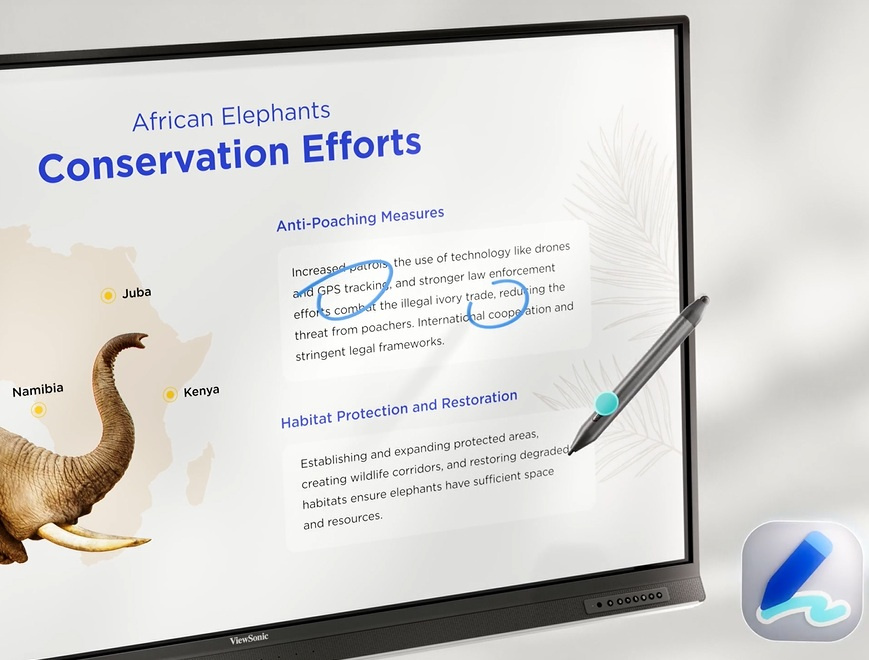 Pomocí aktivního pera provedete rychlé úpravy poznámek, zvýrazníte důležité informace pomocí barev - vylepšete své vizuální prvky a zaujměte snadno pomocí aktivního stylusu ViewSonic.