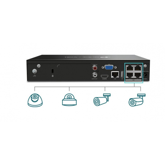 Na záznamovém zařízení najdete čtyři 10/100 Mb/s PoE+ porty. Každý z nich má výkon 30 W. Celkový PoE výkon switche dosahuje 53 W. Pomocí jediného ethernetového kabelu přenáší data i napájení. Nepotřebujete tedy žádný další napájecí adaptér.
