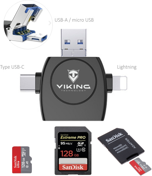 Viking čtečka paměťových karet V4 USB3.0 4v1 • 4 konektory: Lightning, Micro USB, USB-A 3.0, USB-C • Vhodný pro iOS, Android, Windows i Linux • Podpora většiny běžných formátů souborů • Rozšíření paměti telefonu, tabletu nebo notebooku • Malé, lehké zařízení s ochranným pouzdrem • hmotnost 10g