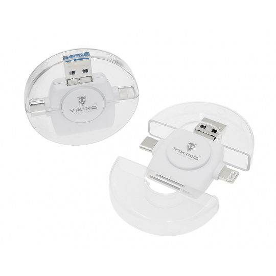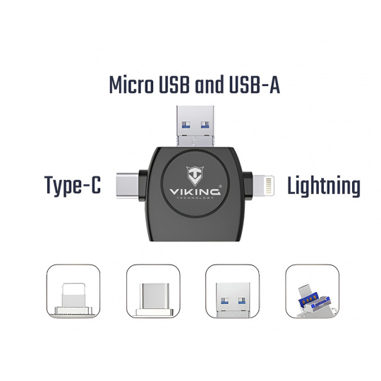 Viking čtečka paměťových karet V4 USB3.0 4v1 • 4 konektory: Lightning, Micro USB, USB-A 3.0, USB-C • Vhodný pro iOS, Android, Windows i Linux • Podpora většiny běžných formátů souborů • Rozšíření paměti telefonu, tabletu nebo notebooku • Malé, lehké zařízení s ochranným pouzdrem • hmotnost 10g