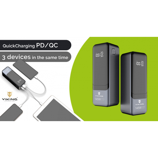 Powerbanka Viking PN-964PD 27000mAh podporuje moderní technologie rychlého nabíjení PD (Power Delivery) a QC (Quick Charge), díky kterým nabijete kompatibilní zařízení mnohem rychleji než běžnou nabíječkou – například mobil až na 50?% kapacity za krátkou dobu. Funguje jak s Androidem, tak s Apple zařízeními, pokud podporují rychlé nabíjení.