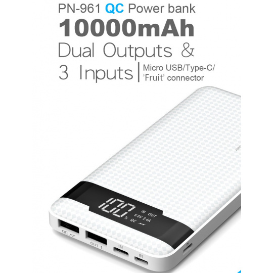 Powerbanka Viking PN-961PD 10000mAh • Kapacita: 10000mAh/37Wh • Maximální výkon: 18W • Rychlé nabíjení PD 3.0 a QC 3.0 • Široká škála vstupů a výstupů (USB-A, USB-C, Micro USB, Apple Lightning) • Vestavěný inteligentní čip (MCU) • LED display
