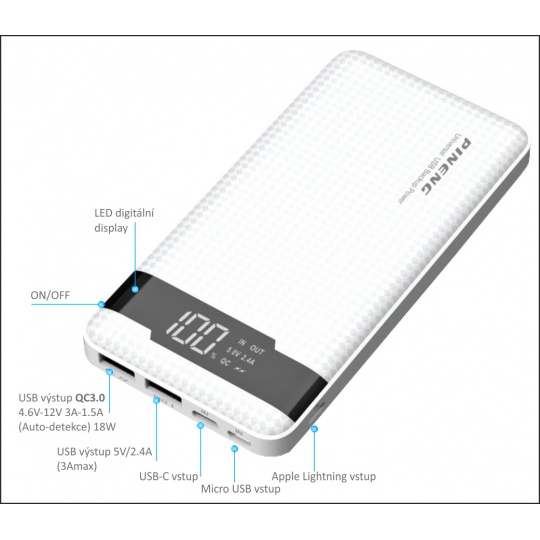 • USB-C, Apple Lightning i Micro USB vstup pro flexibilní možnosti dobíjení powerbanky