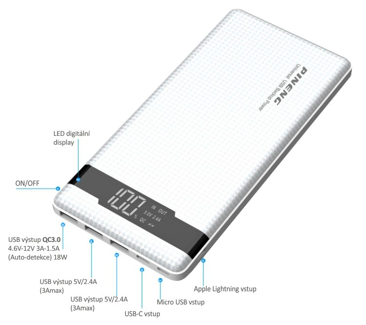 • USB-C, Apple Lightning i Micro USB vstup pro flexibilní možnosti dobíjení powerbanky