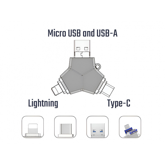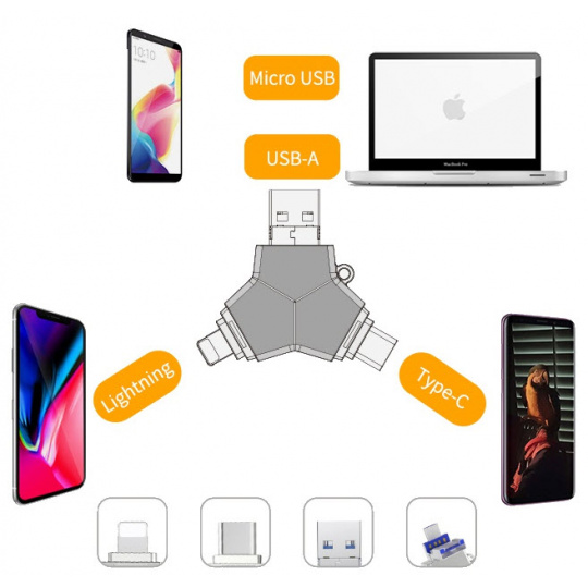 • USB flash disk se čtyřmi konektory USB 3.0, USB-C, Micro USB a Apple Lightning