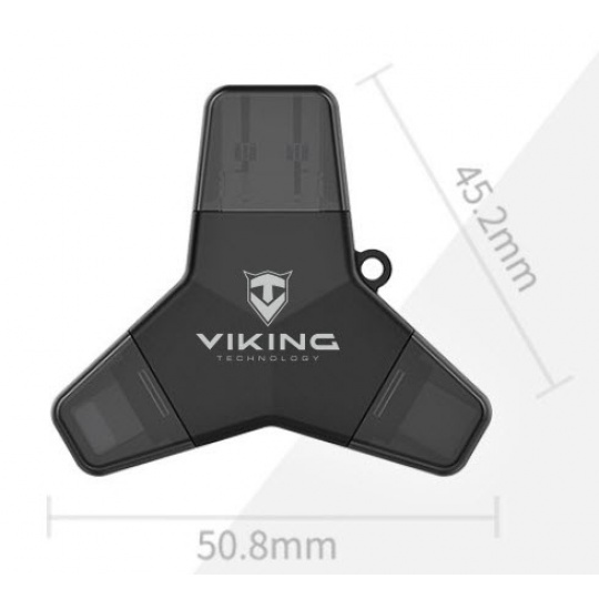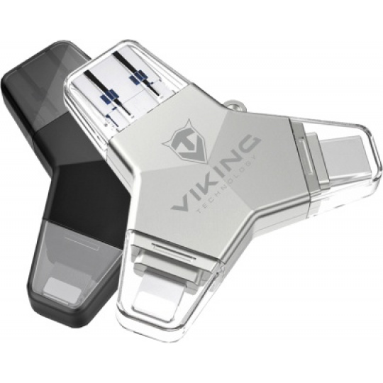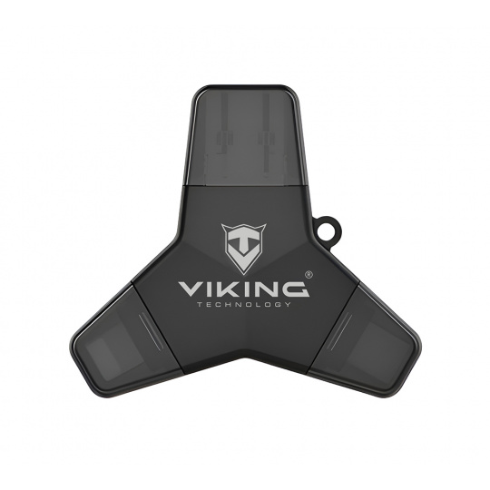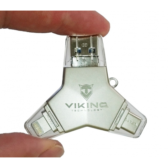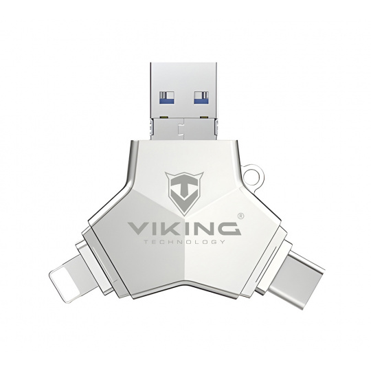 Viking USB flash disk 3.0 • 4 konektory: USB-A, USB-C, Micro USB, Lightning • Tři varianty: 32 GB, 64 GB nebo 128 GB • rychlost až 100?MB/s • podpora FAT32 a exFAT • vhodný pro iOS, Android, PC i Mac • Kompaktní a lehké provedení • hmotnost 17,2?g