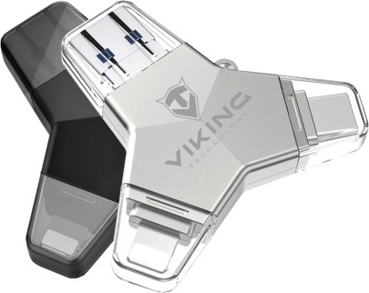 Viking USB flash disk 3.0 • 4 konektory: USB-A, USB-C, Micro USB, Lightning • Tři varianty: 32 GB, 64 GB nebo 128 GB • rychlost až 100?MB/s • podpora FAT32 a exFAT • vhodný pro iOS, Android, PC i Mac • Kompaktní a lehké provedení • hmotnost 17,2?g