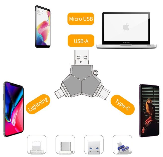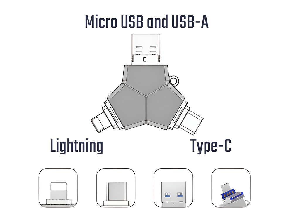 • USB flash disk se čtyřmi konektory USB 3.0, USB-C, Micro USB a Apple Lightning