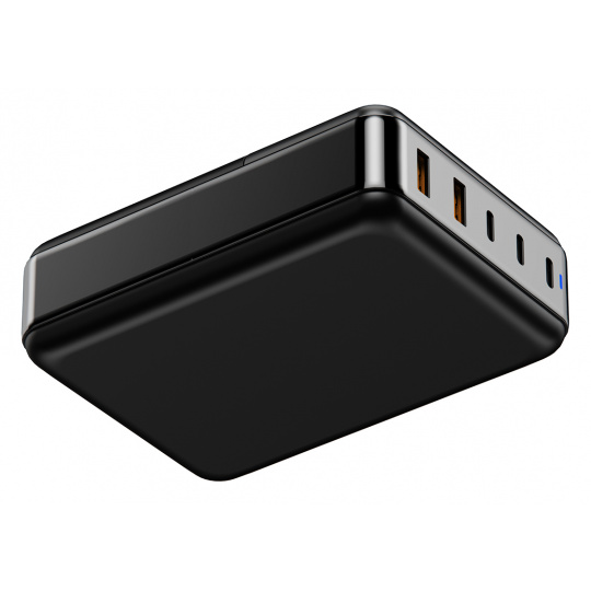 Síťový adaptér • 2 x USB-A QC • 3 x USB-C PD • podpora rychlonabíjení Qualcomm Quick Charge 3.0 a Power Delivery 3.0 • chytré sdílení výkonu • maximální výkon 200W • technologie GaN • možnost nabíjení až 5 zařízení současně • praktický stojan v balení
