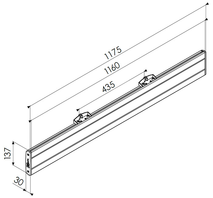 Horizontální část adaptéru systému Connect-it slouží k přímé montáži displeje na zeď, nebo na stropní držáky, stojany a další prvky systému Connect-it. Dodává se v několika délkách, při výběru se řídíme horizontální roztečí montážních otvorů konkrétního displeje (VESA) a jeho šířkou tak, aby adaptér nepřečníval. Ideální pro montáž více displejů vedle sebe a videostěn. Jednotlivé díly lze spolu spojovat do libovolně dlouhých pásů. K vytvoření kompletního adaptéru je třeba horizontální pás doplnit o vertikální ramena PFS 3xxx. Hlavní charakteristiky: uchycuje se na stropní tyče PUC24xx a 25xx nebo podlahové stojiny PUC27xx a 29xx možnost montáže přímo na stěnu nutné doplnit o svislá ramena pro montáž displejů PFS 3xxx možnost spojovat spojkami PFA 9104 v libovolně dlouhý pás, ideální pro více displejů vedle sebe nebo videostěny pro lepší roznesení váhy a větší nosnost lze doplnit o dodatečný úchyt PFA 9126 šířka 1175 mm VESA horizontálně max 1110 mm stylový design, eloxovaný hliník v černém provedení nosnost při montáži do tyčí Connect-it 80 kg s jedním úchytem, 160 kg při použití více úchytů nosnost při montáži přímo na zeď 53 kg s jedním úchytem, 100 kg se 2 úchyty, 160 kg se 3 úchyty