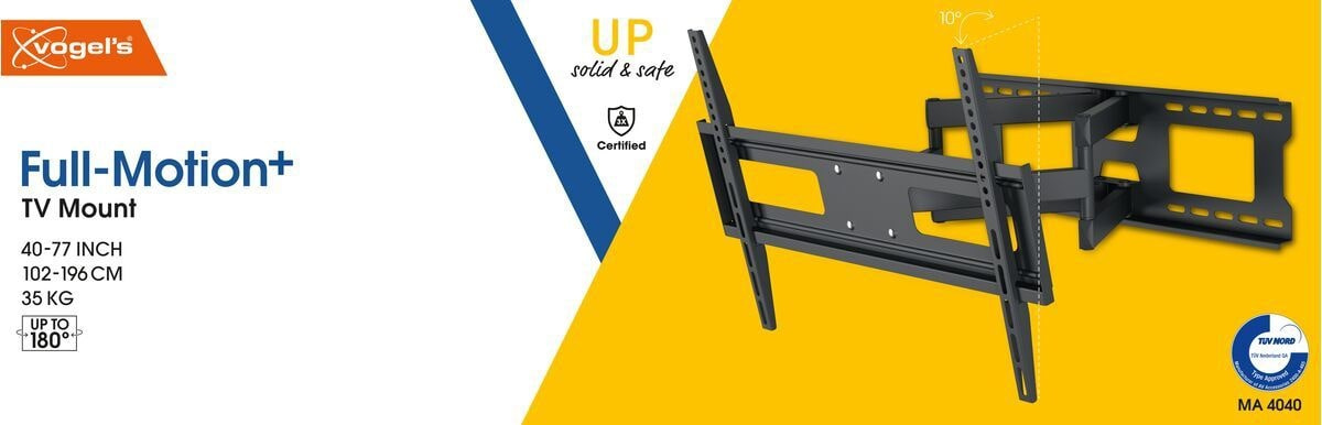 Spolehlivý držák s dvojitým ramenem a 4 klouby. Tento robustní nástěnný držák je vhodný pro televizory s úhlopříčkou od 40 do 77 palců. Snadno si poradí s televizory o hmotnosti až 35 kg. Umožňuje natáčení TV až o 180° a náklon dolů o 10°.
