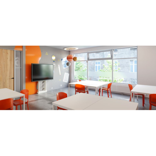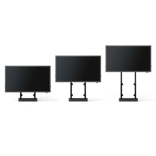 Podlahový stojan RISE 2005 s motorizovaným zdvihem a uchycením ke stěně je určen pro interaktivní ploché displeje s úhlopříčkou až 98" (max. 140 kg).