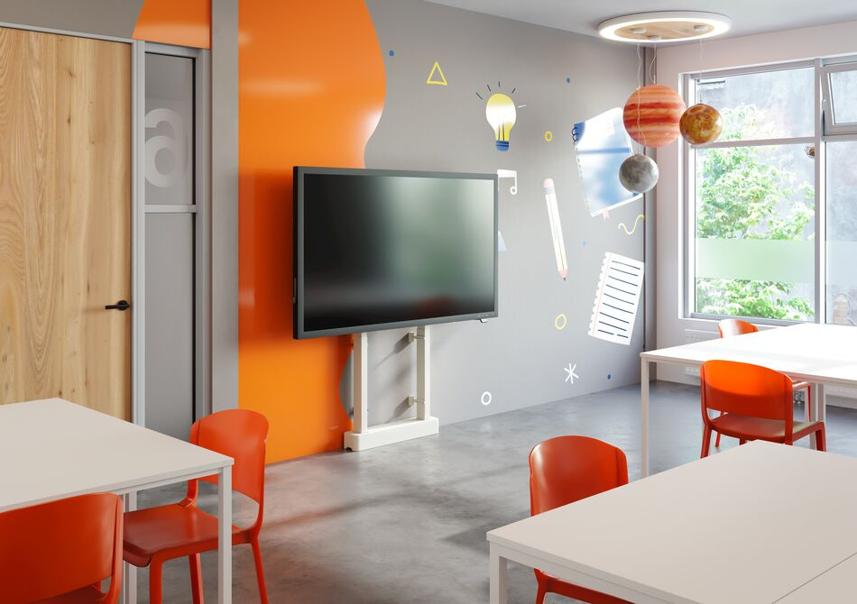 Podlahový stojan RISE 2005 s motorizovaným zdvihem a uchycením ke stěně je určen pro interaktivní ploché displeje s úhlopříčkou až 98" (max. 140 kg).