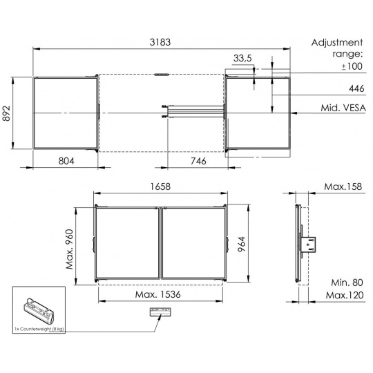 Tabule Vogel's jsou k dispozici pro tři nejběžnější velikosti (interaktivních) obrazovek 65, 75“ a 86“. Díky výškovému a hloubkovému nastavení systému lze tabule bezproblémově přizpůsobit jakémukoli typu (interaktivní) obrazovky.