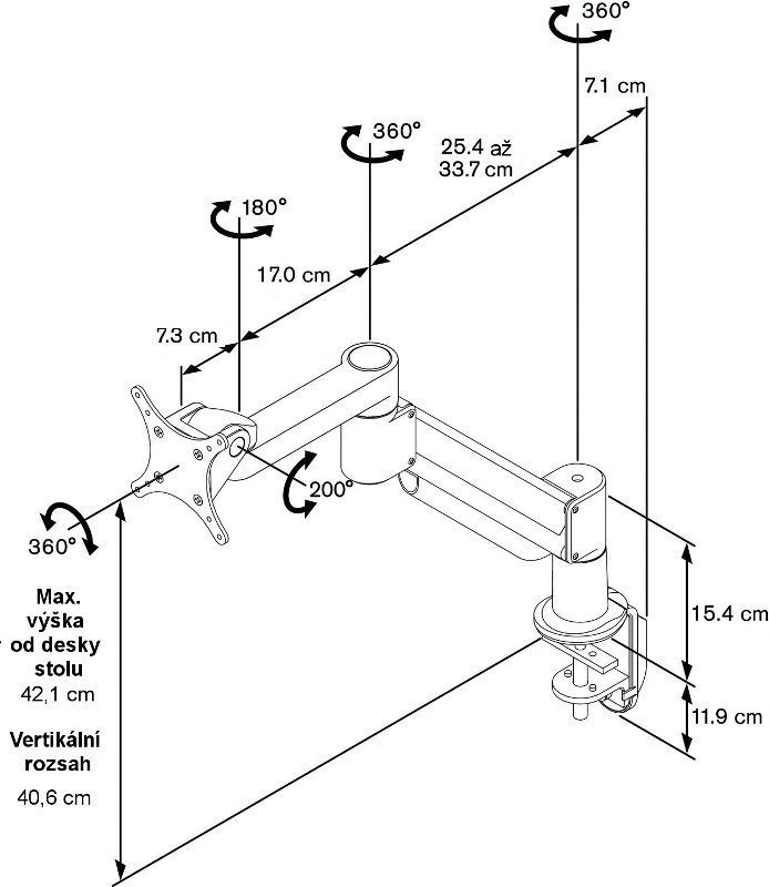 Profesionální držák na menší LCD pro montáž na pracovní stůl, nosnost 1,8 - 6,6 kg * snadné nastavení optimální pozice monitoru konečky prstů * robustní konstrukce pro spolehlivé intenzivní využití v úřadech recepcích, ... * díky plynovým pístům plynule nastavitelná výška * 3 body pro vedení kabelů * možnost rotace monitoru * dvojité rameno se 3 klouby * stylový design * 6 způsobů uchycení ke stolu Specifikace výrobku nosnost 1,8 - 6,6 kg uchycení 100 x 100 mm náklon 200° natáčení 360° materiál kov barva stříbrná