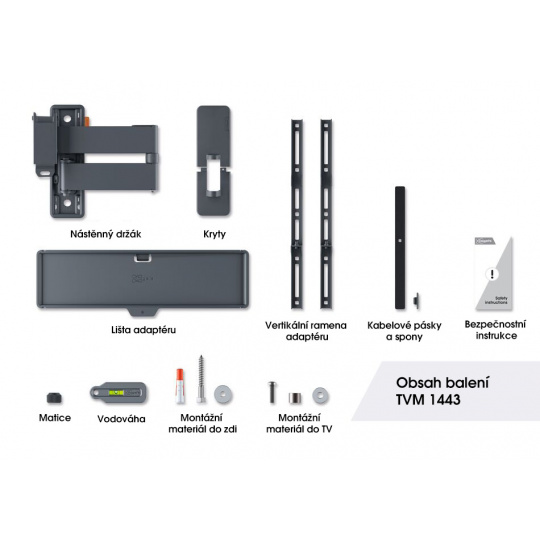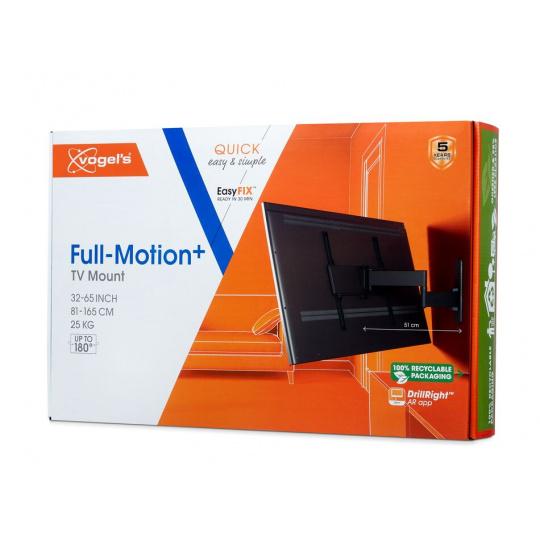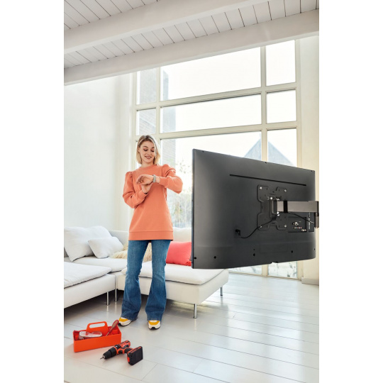 Nástěnný držák televizoru QUICK Full-Motion+ lze otočit až o 180° a naklonit až o 15°. To znamená, že si televizor můžete vychutnat prakticky odkudkoli v místnosti. Navíc instalace tohoto nástěnného držáku televizoru nezabere více než 30 minut. TVM 1643 je vhodný pro televizory s úhlopříčkou 40 až 77 palců a hmotností do 35 kg.