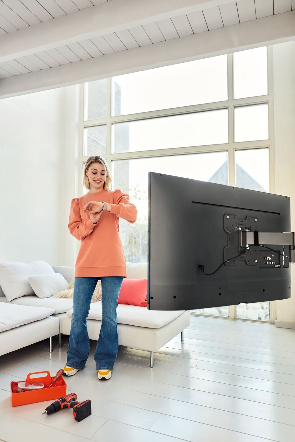 Společnost Vogel's se postará o to, abyste se mohli ihned pustit do práce. Kromě držáku televizoru na stěnu balení obsahuje také vrtací šablonu, šrouby, hmoždinky Fischer® DuoPower, vodováhu a stahovací pásky pro bezpečné svázání kabelů. Pomocí bezplatné aplikace DrillRight™ AR si na stěně snadno vyznačíte první vrtací otvor. Přehledný návod k instalaci najdete ve stručném průvodci instalací. Můžete si také prohlédnout podrobnou příručku nebo instalační video online.