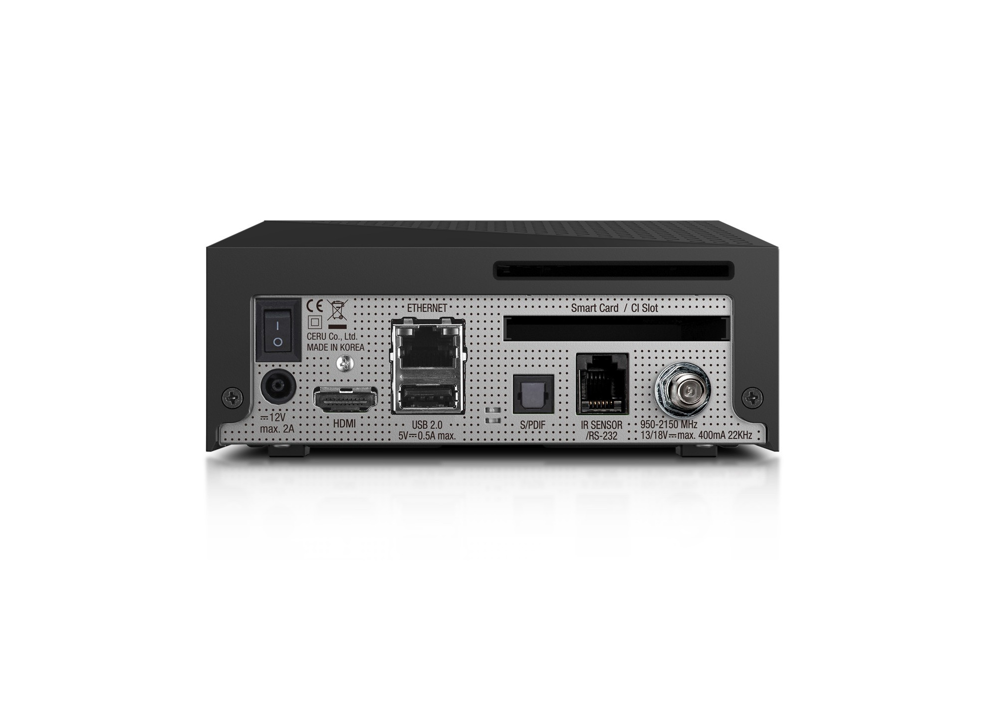 Na zadní straně nechybí ethernet port, HDMI 2.0, USB port USB 2.0 a port pro připojení externího IR čidla. Možnost doložení externího PVR Kitu pro nahrávání na inetrní úložiště HDD.