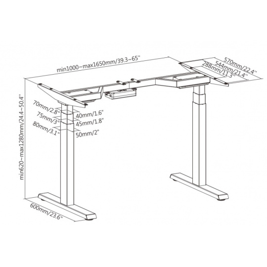 Výškově stavitelná stolová podnož Brateck M08-23DE 2 motory rozsah 620-1280 mm nosnost 100 kg