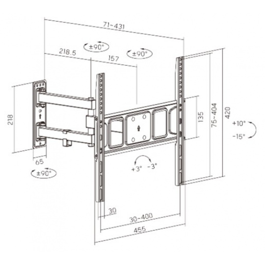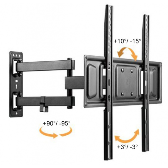 Výsuvný nástěnný držák LPA63-443 je určen pro instalaci TV s plochou obrazovkou s úhlopříčkami od 32“ do 55“. Jeho největší přednostní je robustní výsuvná konstrukce, díky níž unese TV o hmotnosti až 35 kg a zároveň umožňuje nastavit vzdálenost TV od stěny v rozsahu 71 mm až 431 mm, samozřejmostí je pak také velký rozsah polohování. Držák umožňuje snadné naklápění TV v rozsahu +10°~-15°, natočení do stran v rozsahu +90°~-90° a rotaci v rozsahu +3°~-3°, což maximalizuje flexibilitu sledování z libovolného místa v místnosti. Integrovaná svorka na kabely udržuje kabely uspořádané a chráněné.