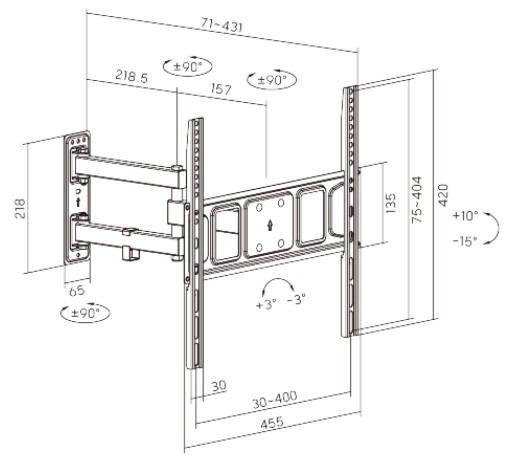 • Výsuvná konstrukce s možností stranového natočení v rozsahu +90°~-90°