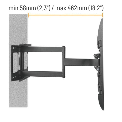Výsuvný nástěnný držák LPA69-463D je určen pro instalaci TV s plochou obrazovkou s úhlopříčkami od 32“ do 70“. Jeho největší přednostní je robustní výsuvná konstrukce, díky níž unese TV o hmotnosti až 45 kg a zároveň umožňuje nastavit vzdálenost TV od stěny v rozsahu 58 mm až 462 mm, samozřejmostí je pak také velký rozsah polohování. Držák umožňuje snadné naklápění TV v rozsahu +5°~-15°, natočení do stran v rozsahu +90°~-90° a rotaci v rozsahu +3°~-3°, což maximalizuje flexibilitu sledování z libovolného místa v místnosti. Integrovaná svorka na kabely udržuje kabely uspořádané a chráněné.