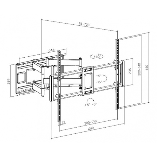 Výsuvný nástěnný držák LPA77-696 je určen pro instalaci TV s plochou obrazovkou s úhlopříčkami od 60“ do 120“. Jeho největší přednostní je robustní výsuvná heavy-duty konstrukce, díky níž unese TV o hmotnosti až 120 kg a zároveň umožňuje nastavit vzdálenost TV od stěny v rozsahu 75 mm až 703 mm, samozřejmostí je pak také velký rozsah polohování. Držák umožňuje snadné naklápění TV v rozsahu +5°~-15°, natočení do stran v rozsahu +60°~-60° a rotaci v rozsahu +5°~-5°, což maximalizuje flexibilitu sledování z libovolného místa v místnosti. Integrovaná svorka na kabely udržuje kabely uspořádané a chráněné.
