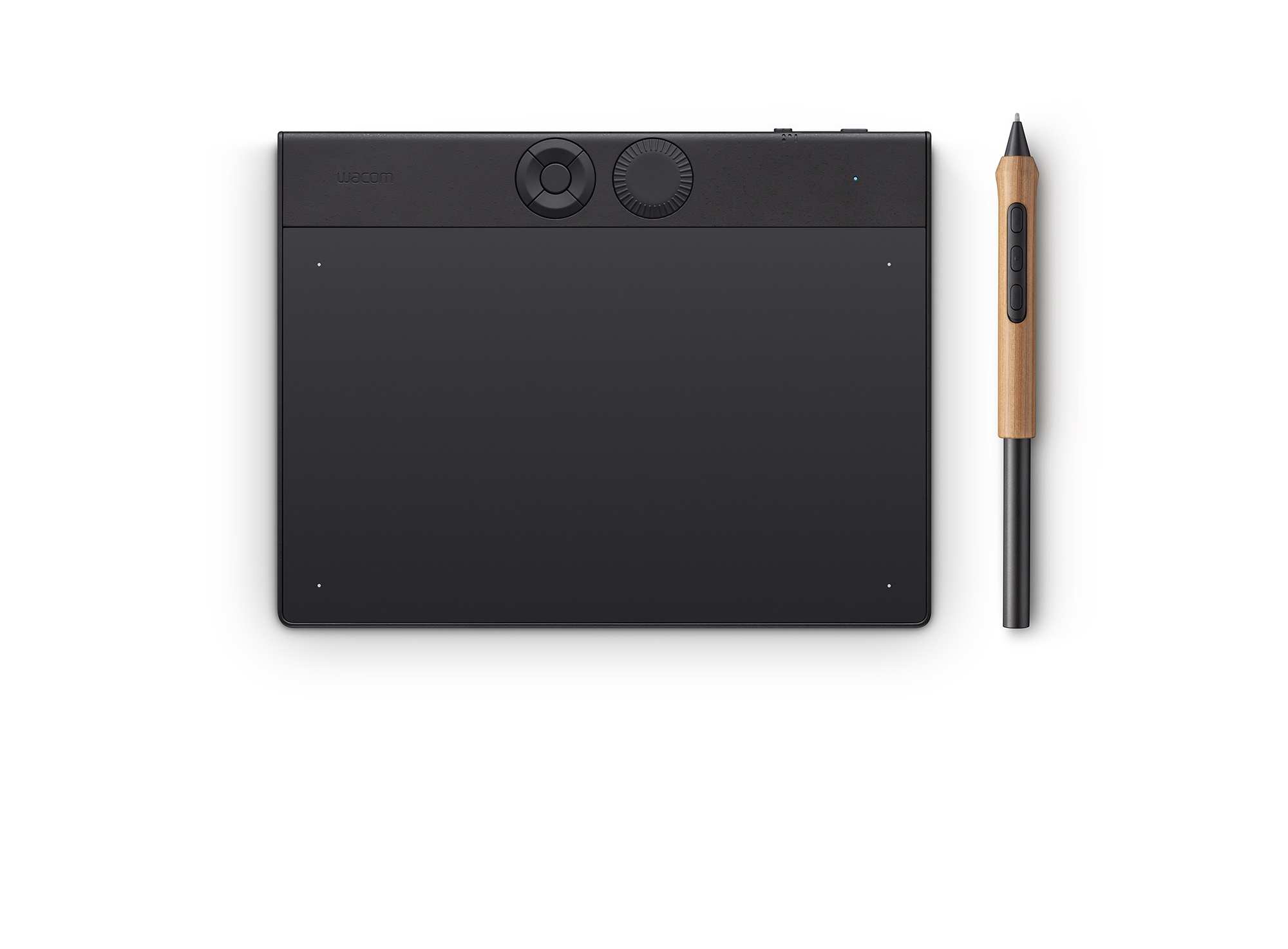 Tlačítka ExpressKeys/ovladače: 10 tlačítek ExpressKeys (5 u modelu small), 2 ovladače (1 u modelu small). Snadno přístupné a přizpůsobitelné pomocí skupiny předvolených nastavení.