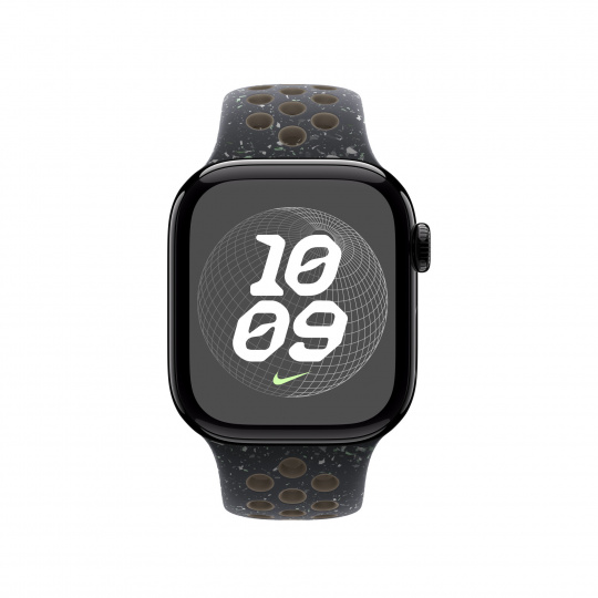 Apple 42mm sportovní řemínek Nike – M/L Tenhle sportovní řemínek Nike má vylisované otvory pro větší vzdušnost, je odolný, pevný a přitom krásně poddajný. Obsahuje barevné vločky vytvářející náhodné vzory, takže každý řemínek je originál. Jeho hladký, hutný materiál se elegantně ovine kolem zápěstí a příjemně sedí. A nově se zapíná na hliníkový kolíček s matným povrchem. Řemínek obsahuje minimálně 30 % recyklovaného fluoroelastomeru, přičemž obsah recyklovaného fluoroelastomeru v každé vločce je minimálně 66 %. V krabici Sportovní řemínek Apple Watch Nike Technické specifikace Materiál: Hliník, Minimálně 30 % recyklovaného fluoroelastomeru Barva: Midnight Sky Nike Velikost řemínku: 150 - 200 mm Kompatibilita - Modely Apple Watch * 38 mm * 40 mm * 41 mm * 42 mm