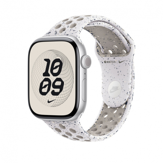 Tenhle sportovní řemínek Nike má vylisované otvory pro větší vzdušnost, je odolný, pevný a přitom překvapivě poddajný. Obsahuje barevné vločky, které tvoří náhodné vzory, takže každý řemínek je originál. Jeho hladký, hutný materiál se elegantně ovine kolem zápěstí a příjemně sedí. A zapíná se na hliníkový kolíček s matným povrchem, do kterého je pečlivě vygravírované logo Nike Run.
