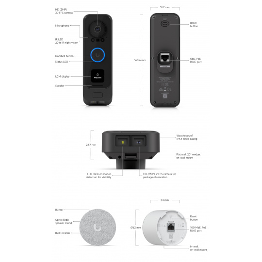 Prémiový zvonek UniFi s integrovaným PoE a přiloženým PoE gongem pro instalaci plug-and-play.