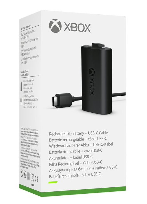 Dobíjecí baterie Xbox + USB-C kabel, plné nabití za 4 hodiny, nabíjí se během hraní i ve stand-by režimu, až 30 hodin provozu na jedno nabití, kompatibilní pouze s originálními gamepady Xbox Wireless Controller s USB-C konektorem.