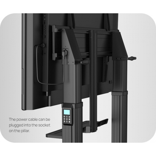 MB-FS-Lift je kompatibilní se zobrazovacími zařízeními Yealink a je dodáván s praktickým úložným prostorem. Podporuje elektrické nastavení výšky s rozsahem až 500 mm a je vybaven funkcí paměti výšky, která uživatelům umožňuje snadno přepínat mezi různými výškami. Flexibilní nastavení výšky Podlahový stojan podporuje elektrické nastavení výšky a funkci paměti výšky s dosahem zdvihu až 500 mm, což flexibilně splňuje požadavky na výšku pro psaní a komunikaci. Integrovaný napájecí zdroj Sloupek podlahového stojanu je vybaven univerzální zásuvkou, která umožňuje přímé napájení konferenčního displeje bez nutnosti dalších zásuvek nebo prodlužovacích kabelů. Efektivní mobilita a stabilita Podlahový stojan je vybaven velkými otočnými kolečky, která zajišťují flexibilní pohyb v různých prostředích a usnadňují rychlé nastavení polohy zařízení. Klíčové parametry: Rozměry stojanu (D/Š/V): 1100 x 600 x (1100~1600) mm Rozměry balení stojanu: 1210 x 705 x 225 mm Hmotnost stojanu: 40 kg Hmotnost netto stojanu: 34 kg Rozměry podnosu: 700 * 200 mm Hmotnost podnosu: 2,8 kg Spotřeba energie v pohotovostním režimu (zapojeno do zásuvky, zatížení 85 kg, bez zvedání): 22 W Provozní spotřeba energie (zapojeno do zásuvky, zatížení 85 kg, zvedání): 880~990 W Spotřeba energie bez zátěže (zapojeno do zásuvky, bez zátěže, zvedání): 220~330 W Rychlost zdvihu: 15 mm/s Výška zdvihu: 500 mm Funkce zvedacího panelu:Zobrazení výšky zdvihu, nastavení výšky, inicializace, přepínač světelných efektů, tlačítko paměti, tlačítko nastavení, dětský zámek Vesa: 400 x 400mm - 1000 x 600mm Maximální nosnost: Maximální nosnost stojanu: 87 kg Maximální nosnost tácku: 10 kg