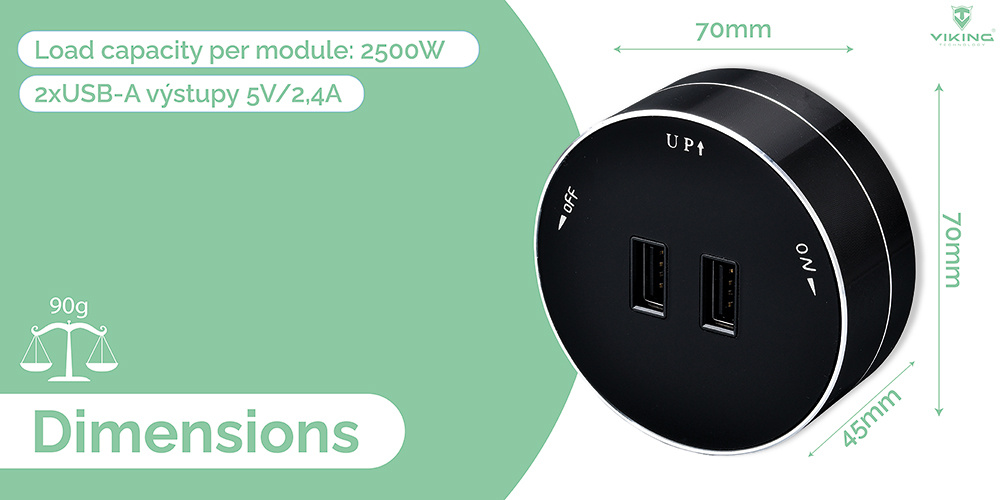 Zásuvkový modul Viking A50S je vybaven USB-A (2x) výstupy 5V/2,4A.