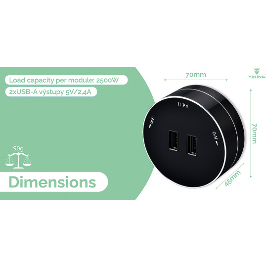 Zásuvkový modul • kompaktní rozměry 7 x 7 x 4,5 cm • 2x USB-A výstup (5V/2,4A) • ideální pro domácí i kancelářské využití • přípojkový konektor 230V, 16A, 50Hz • robustní a odolný design • zátěžový výkon na jeden modul 2500W • snadná manipulace a individuální uspořádání modulů v zásuvkové liště