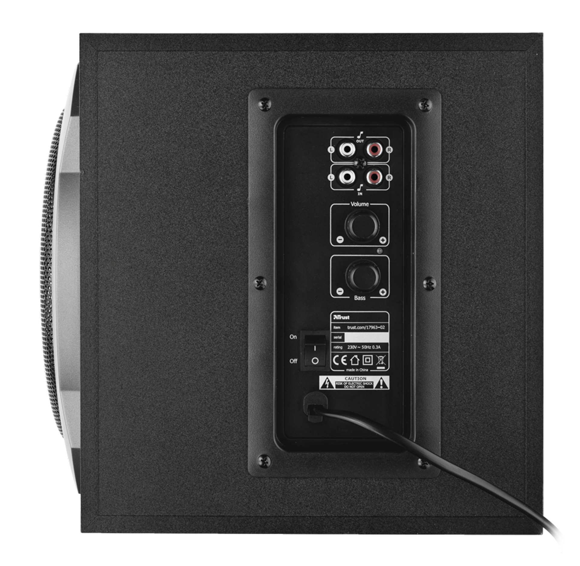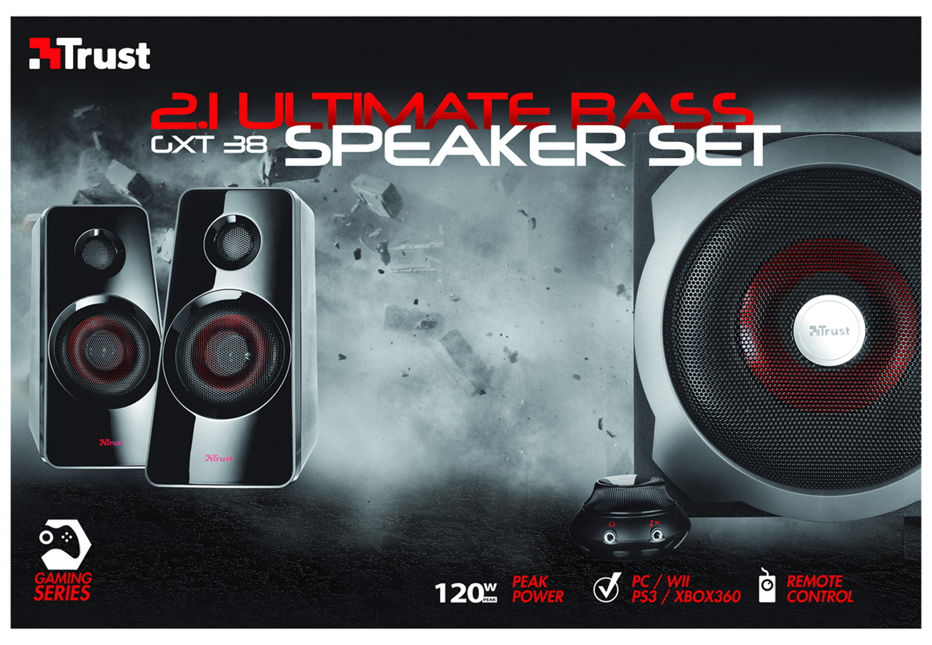 Reproduktory 2.1 se subwooferem * Sestava 2.1 reproduktorů s dřevěným subwooferem a úhrnným výkonem 60 W RMS (maximální výkon 120 wattů) * Vysoce kvalitní zvuk s hlubokým basem * Praktické drátové ovládání hlasitosti pro připojená sluchátka nebo přehrávač iPod/mp3 * Postranní ovládání hlasitosti a basů * 4 v 1: Kompatibilní s PC, Wii, Sony PlayStation 3 a Xbox 360 * Inteligentní správa napájení: automaticky přejde do pohotovostního stavu po určité době nečinnosti Obsah balení * Subwoofer s připojeným napájecím kabelem * 2 satelitní reproduktory s připojeným kabelem * Kabelové dálkové ovládání s připojeným zvukovým kabelem * Kabel s redukcí pro připojení herní konzole * Uživatelská příručka Systémové požadavky: * PC nebo notebook s 3,5 mm audio připojením * Wii, Playstation 3 nebo Xbox 360 herní konzole (vyžaduje AV-kabel, který je součástí vaší herní konzole) * Připojení do elektrické zásuvky Více na webu výrobce: http://www.trust.com/en/product/19023-gxt-38-2-1-ultimate-bass-speaker-set